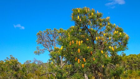 native Australian banksia plant outdoor in sunny backyard shot at shallow depth of field