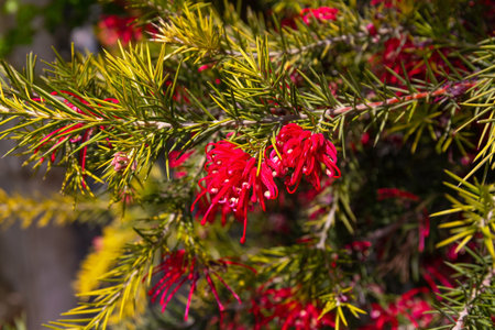 native Australian Grevillea Bon Accord plant outdoor in beautiful tropical backyard shot at shallow depth of field
