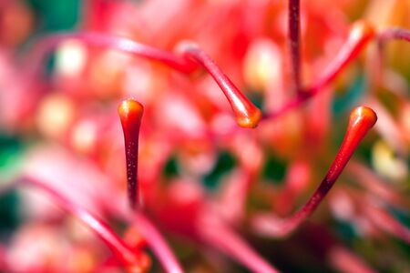 native Australian protea with red flowers outdoor with raindrops in beautiful tropical backyard shot at shallow depth of field