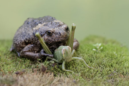 Man holding a small forest frog toad close-up. People interacting with little wild reptile animal in Taiwan. Tiny baby of Hyla Chinensis tadpole is sitting on the finger. Care of environment concept.