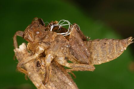 Macro shot of a Leafhopper insect perched on wooden plank.