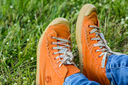 Canvas shoes soles of a girl sitting on the grass in a park - Teenager relaxing and enjoying the leisure on a public domain space in the city