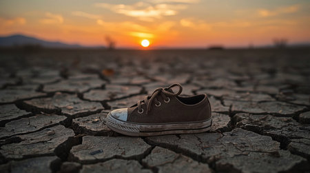 Conceptual image of a shoe on cracked ground with sunset background