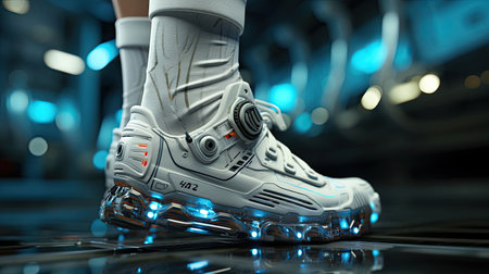 Futuristic glowing fashionable sneakers on feet