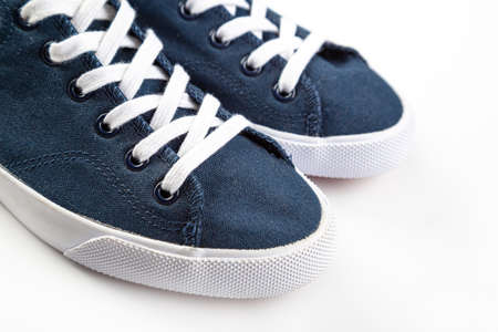 blue sneakers on white background with copy space. Youth shoes. close up
