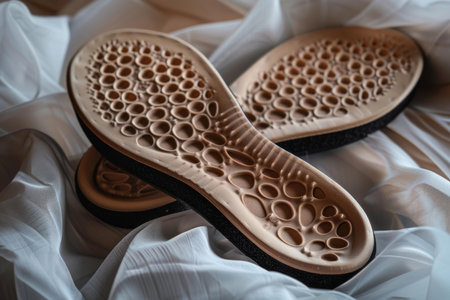 Two orthopedic insoles are lying on a white fabric, offering arch support and promoting foot health
