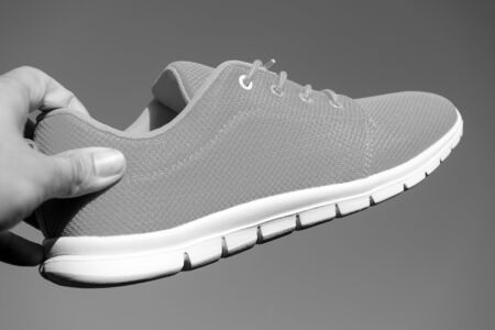 Sports sneakers with flying laces on gray background