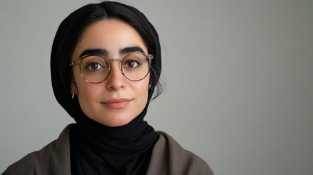 A professional Middle Eastern woman wearing glasses and a headscarf poses in a casual work setting, showcasing confidence and engagement.