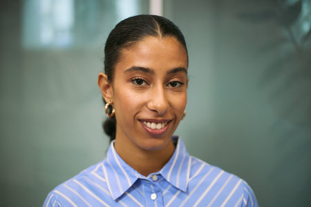 Portrait of young adult Black woman smiling and looking into camera in business setting, hair pulled back, wearing earrings, standing against blurred office background
