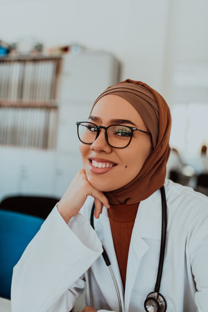 A Muslim female doctor wearing a hijab in a hospital setting.