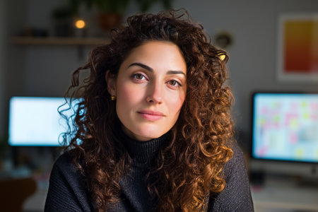 Portrait of a young woman with curly brown hair, wearing a dark turtleneck sweater, seated at her desk with computer monitors in the background.