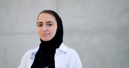 Close up of a smiling young muslim woman in hijab standing on a street looking at camera