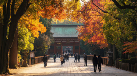 A tranquil scene of Tokyo's Meiji Shrine, framed by maple trees ablaze with autumn colors. Visitors, both locals and tourists, walk along the peaceful pathways
