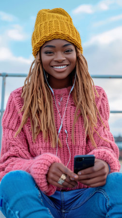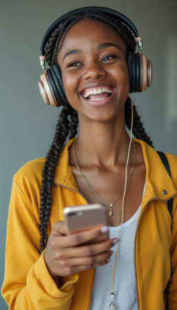 A cheerful young Black woman with braided hair smiles brightly while wearing stylish headphones and holding a smartphone. Her vibrant yellow jacket adds a pop of color, radiating positivity and a love for music.