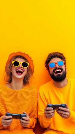 A joyful young couple is engaged in a video game session sharing laughter and fun. Dressed in vibrant yellow outfits they are sitting close together immersed in their activity.