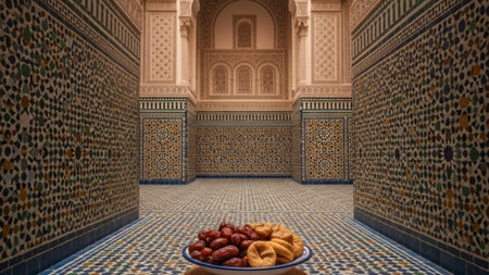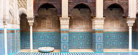 FEZ, MOROCCO - JUNE 02, 2017: Walls decorations of the Zawiya of Moulay Idris II (with the tomb of Idris II, who ruled Morocco from 807 to 828 and is considered the main founder of the city of Fes).