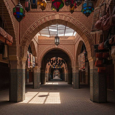 A stunning view of a Moroccan marketplace with colorful lanterns and intricate architecture
