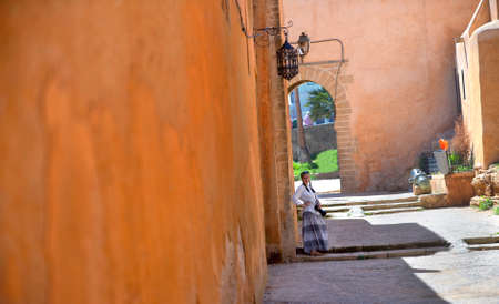girl walks with the camera on the historic center the cities of Rabat, Morocco
