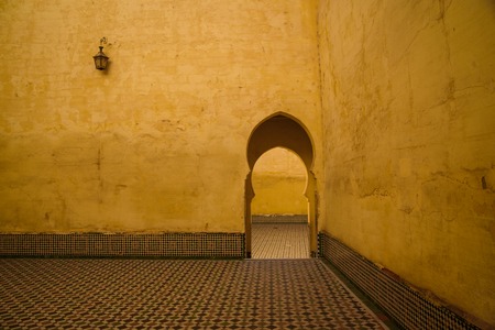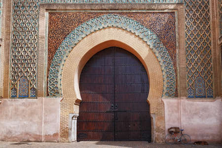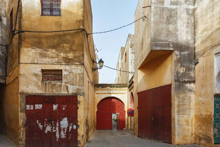 MEKNES, MOROCCO - JUNE 01, 2017: Ancient gate in Meknes historical center. Meknes is one of the four Imperial cities of Morocco and the sixth largest city by population in the kingdom.