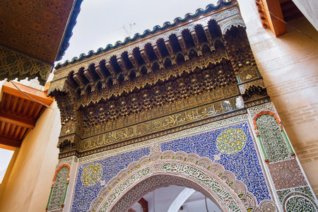 Fez, Morocco - November 12, 2019: Interior of Al-Attarine Madrasa (Islamic Training Center)