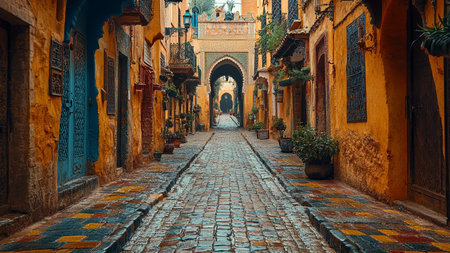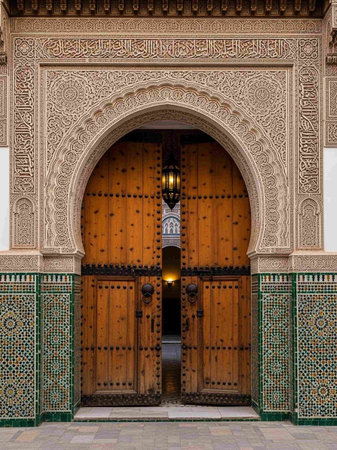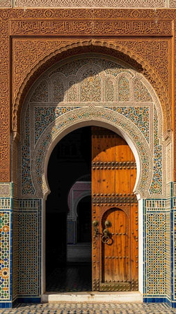 Vibrant colors of ancient Marrakech souk, intricate tile work, and rustic wooden Doors, capture the essence of Moroccan cultural heritage and adventure.