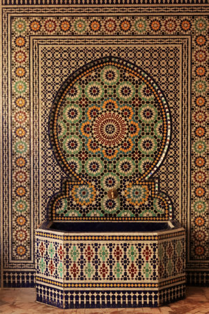 Non functional water tap on the street in Rabat, Morocco. Geometric pattern of the colorful traditional mosaic. Two baskets on the small wall and an old chair. Weathered wall with an arch and column.