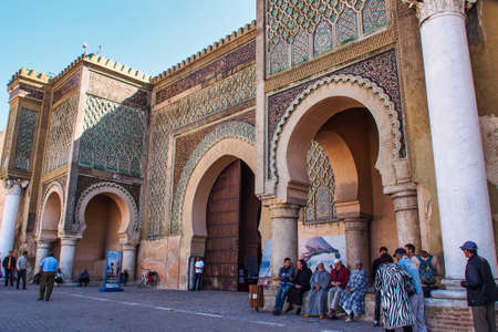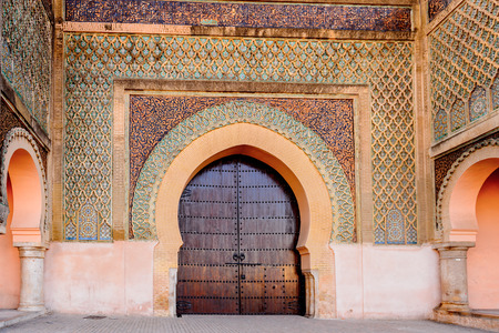 MEKNES, MOROCCO - JUNE 01, 2017: Bab Mansour Gate in Meknes (the gate finished in 1732). Meknes is one of the four Imperial cities of Morocco and the sixth largest city by population in the kingdom.