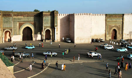 MEKNES / MOROCCO-12.06.2019. Road with cars in front of the main and most beautiful gate of Meknes Bab-El-Mansur.