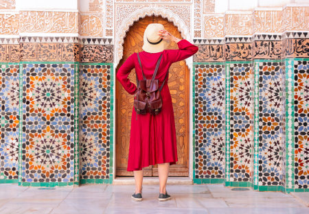 Girl dressing in red with hat looking Ben Youssef Madrasa in marrakesh morocco