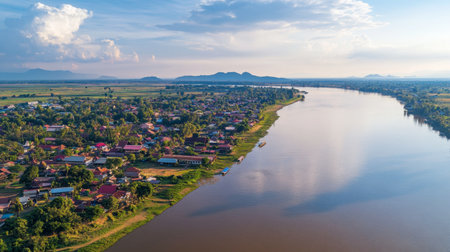 Expansive view of the Mekong river flowing alongside the lush green hills and cityscape of Luang Prabang, Laos. The landscape features clear blue sky, scattered clouds, and distant mountain ranges in Southeast Asia.