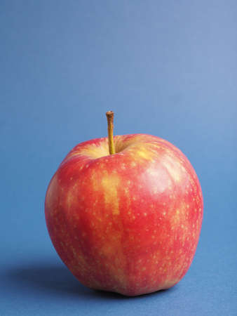One fresh red organic apple on a blue studio background, horizontal landscape view