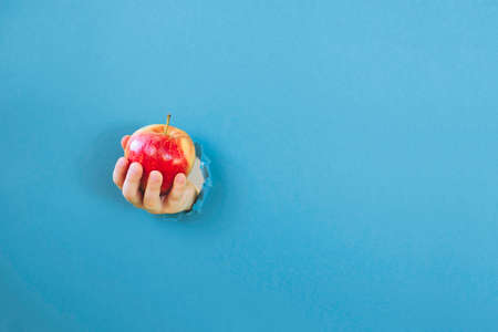 Hand of the child is holding red apple inserted through a hole in torn blue paper. Copy space.
