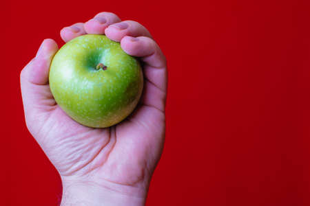 Green apple held by hand with red background.