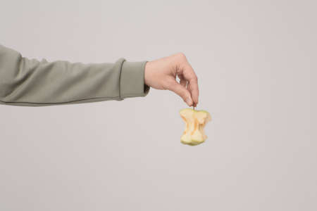 woman hand holding red apple on gray background