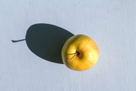 yellow apple with a hard sunlight and deep shadow on a table, zero waste still life and healthy food concept, empty space for text