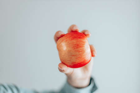 Red apple in female hand isolated on grey wall background. Healthy nutrition diet. Vitamin snack.
