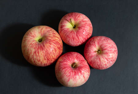 Four red apples on a black background close up. Striped apples. Juicy fresh ripe fruit. View from above.