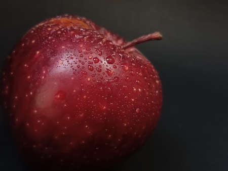Red delicious apple with water drops, dark moody photo. Abstract fruit backgrounds