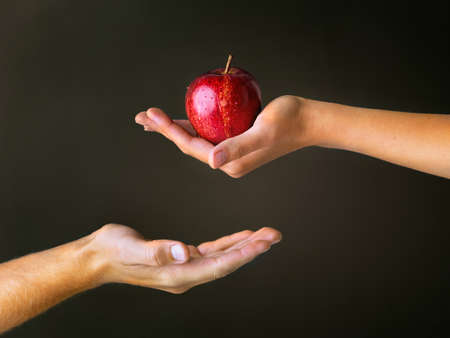 Gifts from The Garden of Eden. Cropped studio shot of a woman offering a man a red apple against a dark background.