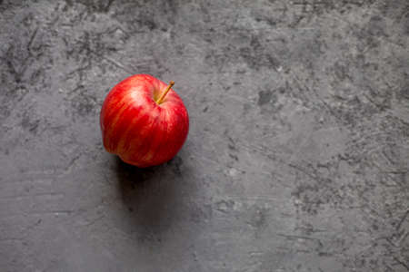 one Ripe garden red apples on gray concrete. Fruits concept of the fall harvest. Space for text.