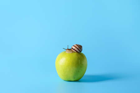 Snail and apple on color background