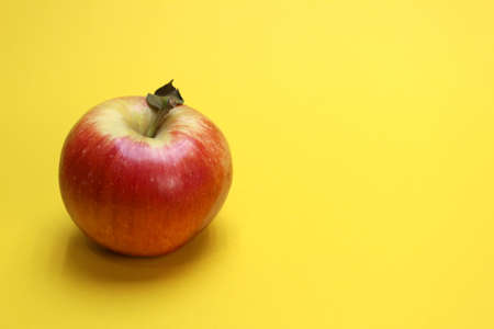 red apple with dry petal lies on yellow background
