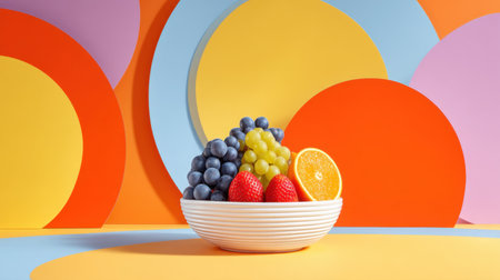 This stunning image features a bowl filled with fresh and colorful fruits, complemented by a vibrant geometric background, perfect for promoting healthy eating and fresh produce.