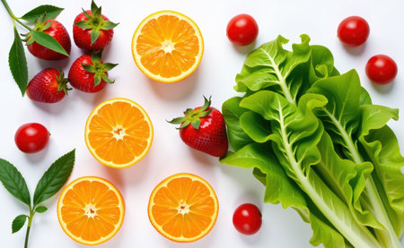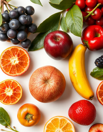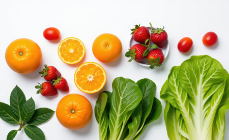 Fresh fruits and vegetables arranged on a clean white background, showcasing healthy food choices and vibrant colors.
