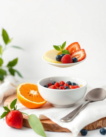 Top-down view of vibrant organic fruits in a white container on a white backdrop, emphasizing health and nutrition, Dutch angle shot in bright pop style, illuminated by radiant noon sunlight.