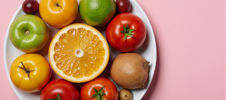 A plate of fruit and vegetables on a pink surface. Generative AI image.