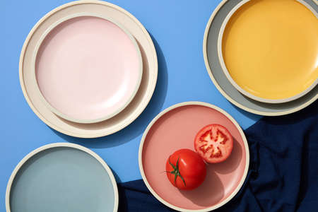A close-up showcases a plate filled with colorful fruits and vegetables. The composition includes a pineapple, oranges, tomatoes, and other items. The objects are presented on a white plate against a vibrant blue backdrop. This image could be used for healthy eating, food preparation, or culinary articles.
