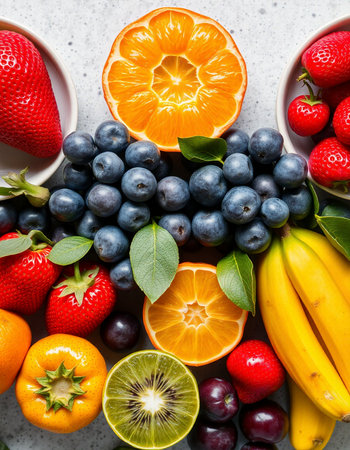Variety of fresh fruits including strawberries, blueberries, oranges, lemons, kiwi, grapefruits and strawberries.