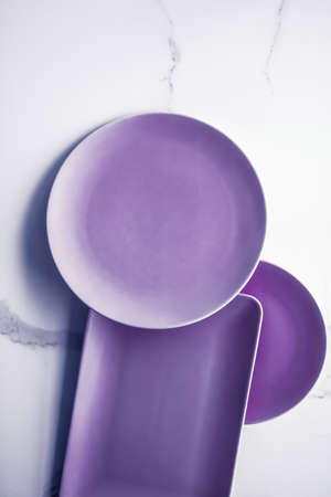 Branding, cuisine and culinary concept - Purple empty plate on marble table background, tableware decor for breakfast, lunch and dinner for restaurant brand menu recipe, luxury holiday flatlay design