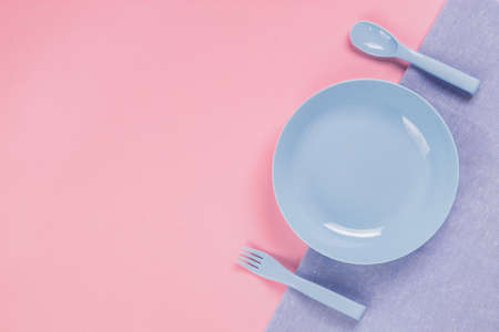 Blue plastic plate with spoon and fork on pink background